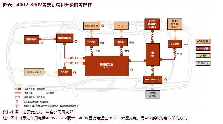 对于车辆而言,电压升高意味着大三电(驱动电机总成、控制器总成、传动总成)以及小三电(DC/DC直流变换器、车载充电机OBC、高压配电盒PDU)、空调系统都要适配更高的电压平台,需要重新选型。