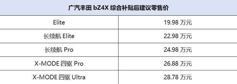 (2022年10月10日)我,与你同行!广汽丰田首款e-TNGA纯电中型SUV bZ4X正式上市,开启广汽丰田纯电新纪元。新车共推出五大配置版本,综合补贴后建议零售价19.98万元-28.78万元。全球旗舰品质,全新专属工厂,广汽丰田bZ4X将以超越以往的先端科技魅力,为用户带来“一秒惊艳,长久安心”的纯电新体验。