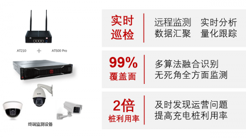天宫AI智能安全运营服务方案充分调用天宫AT210 边缘盒子与AT500 Pro边缘服务器的AI能力,提供推理+训练+计算的一体服务,可实现图像、视频等多种类型的数据分析和推理计算,结合终端设备对充电站区域进行远程无死角监测: