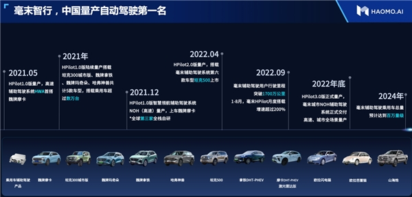 而在国内,毫末智行HPilot已经实现了三次迭代,覆盖高速、城市等全场景。此外,采用了重感知、轻地图、大算力技术路线的毫末城市NOH辅助驾驶,将搭载于魏牌摩卡 DHT-PHEV 激光雷达版,于2022年第四季度正式上市交付。截至2022年10月,毫末辅助驾驶用户行驶里程也已突破2000万公里,毫末HPilot月搭载平均增速超200%,搭载于长城明星车型超10款,包括魏牌摩卡、魏牌拿铁、魏牌玛奇朵、坦克300、坦克500、哈弗神兽、拿铁 DHT-PHEV 等上市车型,还有摩卡 DHT-PHEV 激光雷达版、欧拉闪电猫、欧拉芭蕾猫、全新一代长城炮等车型正在陆续交付中。未来搭载车型达到百万量级。