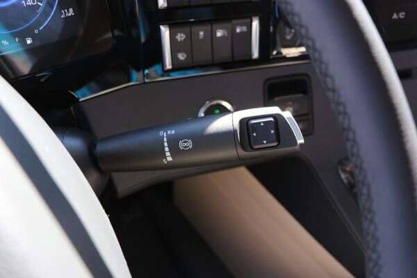 四辐式多功能方向盘左右两侧配有换挡拨片,方向盘下半部分配备了定速巡航功能,在这个位置操作定速巡航不仅方便,还更有高级感。另外,在副驾驶前面,还配有可伸缩小桌板,最大可承重3公斤。