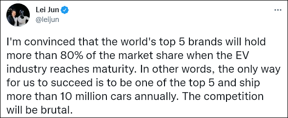在雷军看来,市场份额高度集中在头部企业。当电动车行业成熟时,全球前五大品牌将占据80%以上的市场份额。因而雷军认为,小米汽车成功的唯一途径是成为行业前五,每年出货超过1000万辆汽车。