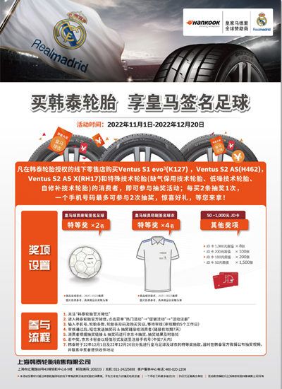 · 活动期间购买韩泰轮胎指定产品,有机会赢得皇马签名足球、球衣、京东卡