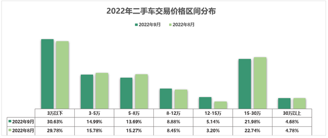 新能源汽车方面,今年9月,8-15万元的新能二手车增长明显,占比为14%较上月增加了2.4%,其中12-15万元区间的新能源二手车占5.14%,较上月增加了1.94%。15万元以上的车型占26.67%,较上月下降了0.85个百分点,其中15-30万元区间占21.98%,较上月下降了0.75%。