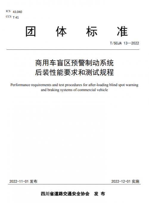基于此,所托瑞安汽车科技集团(以下简称“所托瑞安”)率先提出了《商用车盲区预警制动系统后装性能要求和测试规程》标准的编制立项建议,并主动邀请了成都市公安局交通管理局、四川畅翼科技有限责任公司、成都市城市安全与应急管理研究院先后加入组成联合编制工作组,一同完成本次标准的制定工作。该团体标准已于2022年7月通过四川省道路交通安全协会审查,已于《全国团体标准信息平台》公示发布。近日,该标准已通过四川省道路交通安全协会批准、正式发布,并将于2022年12月1日起正式实施。