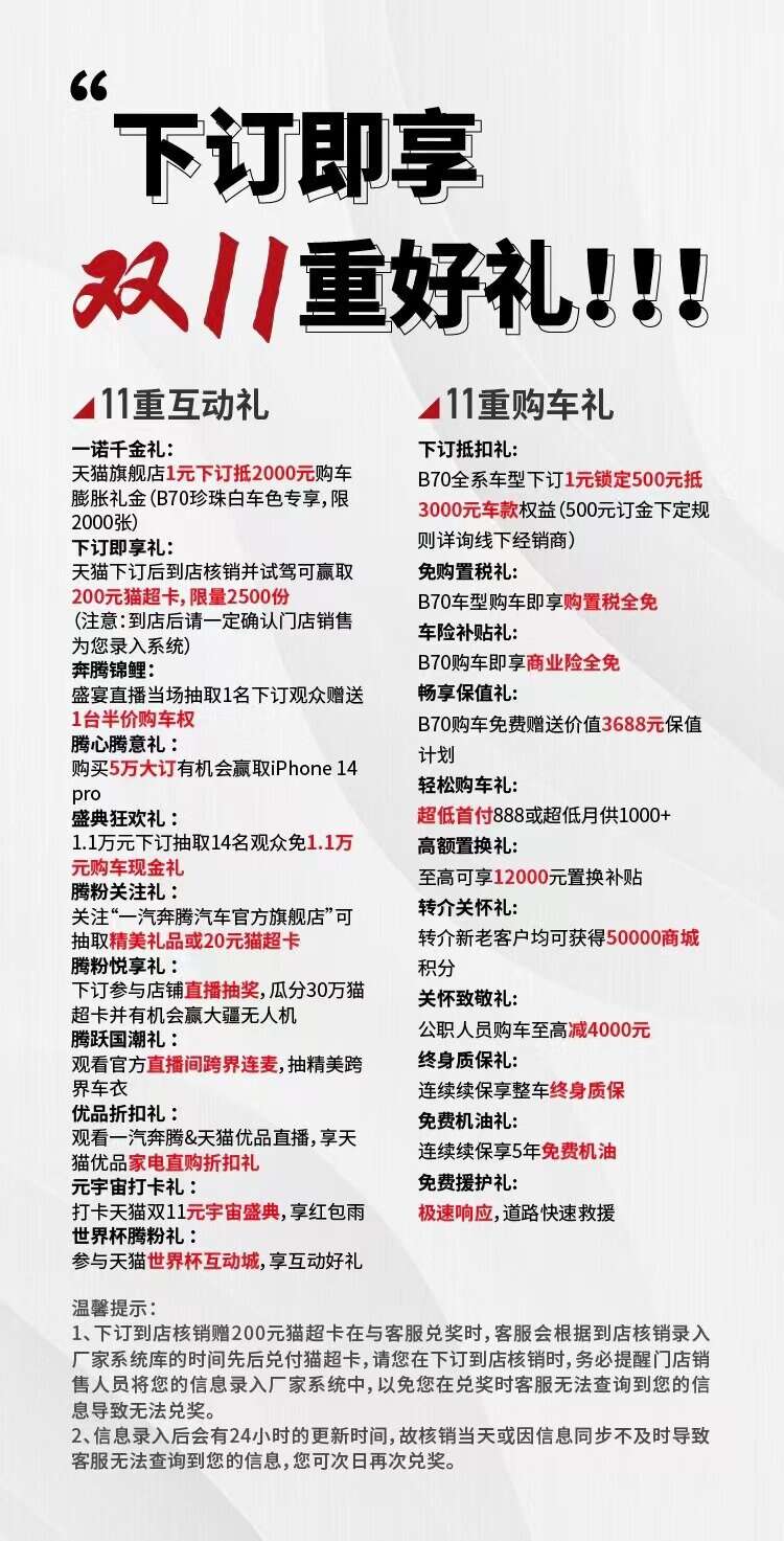 11月10日,由一汽奔腾携手天猫汽车打造的「腾粉购车节·双11惠动车生活」超级大牌日直播盛典在浙江杭州盛大开启,在近3小时的直播中,奔腾B70等热销车型携手11重互动礼和11重购车礼重磅亮相,车圈达人说车种草直击场景化需求,更有品牌BOSS惊喜空降,现场抽奖豪送半价车!除此之外,直播间还为下订用户抽取了多个1.1万免订金、iPhone14pro、大疆无人机等超值好礼,以力度空前的购车权益为粉丝打造了一场一汽奔腾车主专属的双11狂欢盛典。
