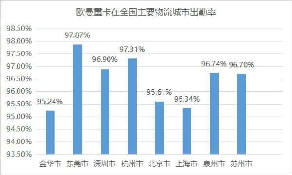在全国主要物流大城中,欧曼重卡的出勤率也是遥遥领先,其中在东莞市更是高达97.87%。快递运输贵在效率,赢在畅通无阻。运输快一小时、消费者就能早一小时拿到物品。而以欧曼自动挡重卡为代表的运输战车,可靠性高、出勤率高,能保证运输路线的高效畅通,大幅降低快递企业运维成本,赢得了头部快递行业的广泛认可,也成为他们的优选重卡。