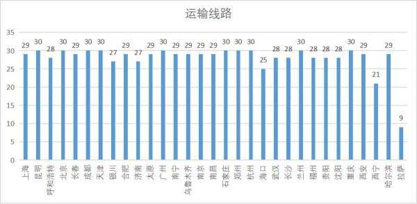 可以说北至黑龙江内蒙、南到海南云南、西入西藏新疆、东进上海广州,几乎包括了全国的所有物流运输路线。其中,车次数≥5000的线路共有40条,3000—5000之间的共有34条,2000—3000之间的共有21条,1000—2000之间的共有60条。
