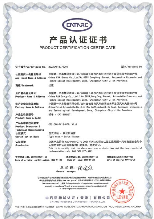 该认证基于相关法规、标准和技术规范,主要从“合规性审查”与“汽车数据安全与隐私保护测试”两大板块进行验证,包含车外人脸信息匿名化处理测试、座舱数据车内处理测试、个人信息的显著告知处理测试等几个方面。全新红旗H5凭借出色的表现,彰显了在加强个人信息和重要数据保护,规范汽车数据处理活动方面的软硬件能力。一汽红旗充分发挥产品研发的综合优势,展现出智能安全配置的不凡实力,在汽车数据安全管理和保障方面以较高水平一马当先获得认证。