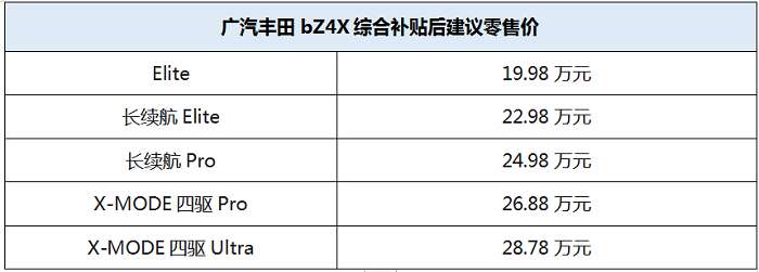 广汽丰田bZ4X以19.98万元的起售价, 全系标配包括TSS 3.0智行安全辅助套装、车联网远程控制、OTA远程升级、高效节能热泵、8个SRS空气囊(包括主、副驾驶席膝部SRS空气囊)、TPMS胎压监测系统(带数值显示)等多项同级领先配置,真正做到入门即高配。