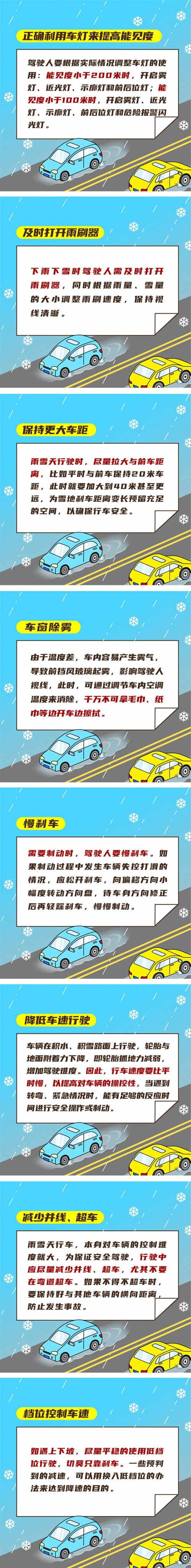 在此要提醒广大驾驶人:出行前一定要提前了解天气情况,合理规划行车线路。遇雨雪天气行车要牢记“降速、控距、亮尾”,打开雾灯、示廓灯、危险报警闪光灯,保持与横向、纵向车辆的安全距离。要尽量避免变道行驶、强超强会、急刹急转,以防发生危险。