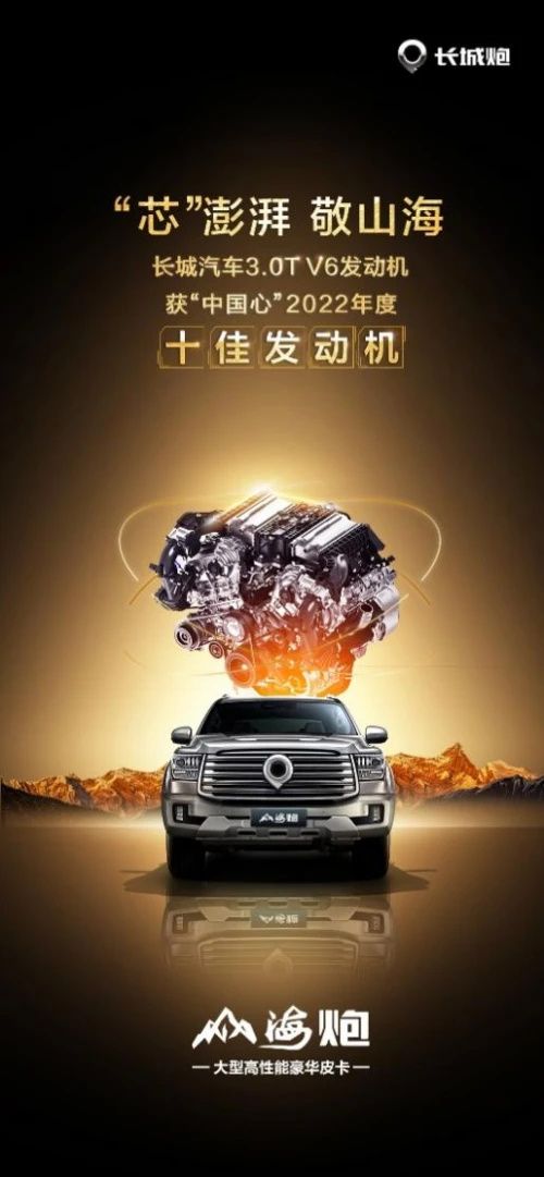 此次获奖的长城3.0T V6发动机,将在长城炮旗下中国首款、大型高性能豪华皮卡山海炮上搭载,满足全球用户对于高阶动力皮卡的用车需求。山海炮不久将上市并登陆全球市场,让人期待。