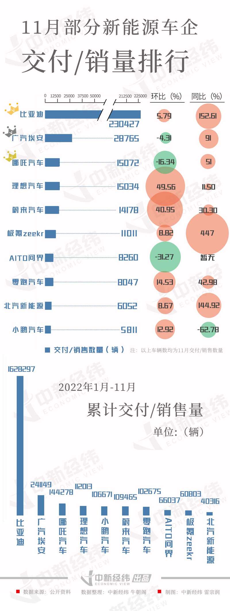 中新经纬12月3日电 (牛朝阁) 近日,多家车企公布交付数据。数据显示,比亚迪、广汽埃安、哪吒汽车11月交付排行榜前三,多家车企2022年累计交付破十万辆,AITO问界遭遇交付滑坡,而小鹏汽车则持续掉队。