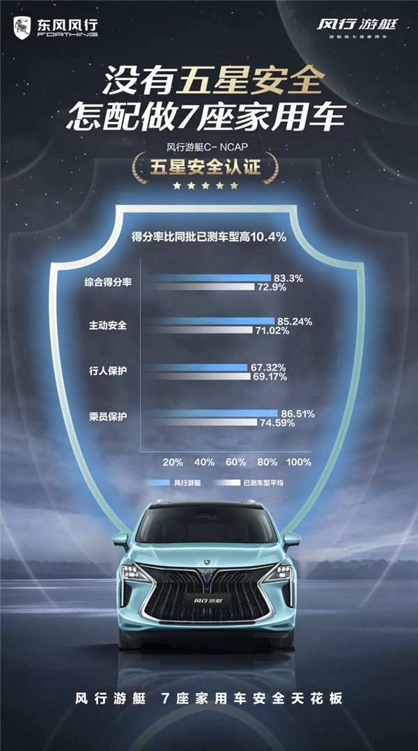 仔细了解才知道,原来是12月1日,中汽中心汽车测评管理中心公布了最新的C-NCAP测试结果,风行游艇成功挑战史上最严规程——2021版C-NCAP规程,以综合得分率高达83.3%的成绩斩获五星认证,成为汽车史上首个以MPV车型身份成功挑战2021版C-NCAP规程并获得五星认证的7座家用车。