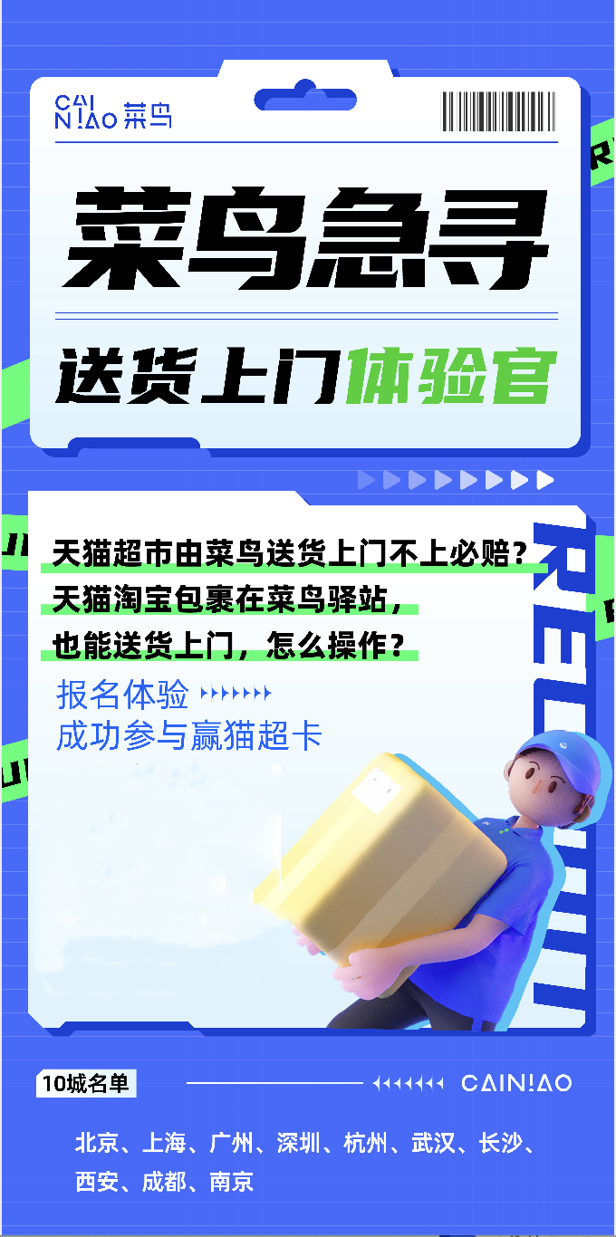 菜鸟十城启动招募“送货上门体验官”,深入体验菜鸟直送菜鸟驿站送货上门