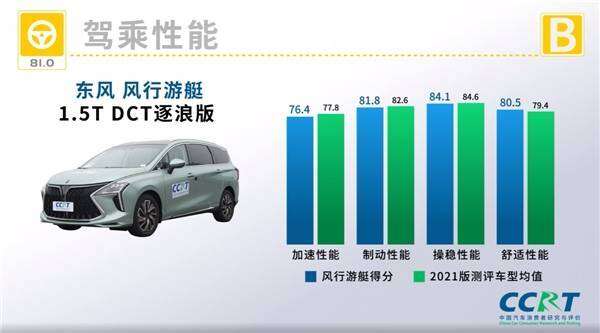 驾乘性能是CCRT的另一个重点项目,其中包含操控稳定性、加速、制动以及占比最大的舒适性评测。其中,风行游艇的驾驶性能得到81.0分,其中百公里加速时间实测10.7秒,加速性能获得76.4分,非常接近通常竞技的轿车和SUV。而在MPV的传统弱势项目操控稳定性环节,风行游艇获得84.1分,其中避障操纵性能和蛇形操纵性能均获不俗的成绩。