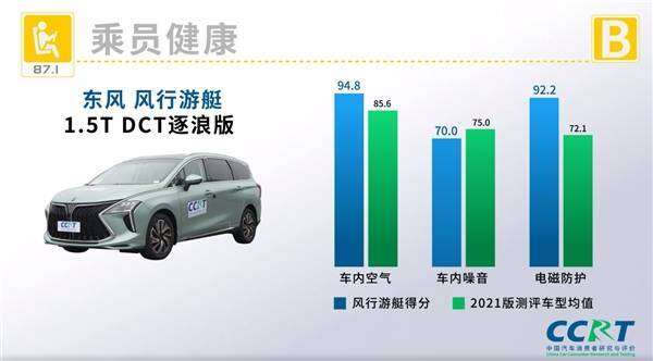 舒适和环保是当今消费者看重的主要品质,所以CCRT中专门设立了“乘员健康”指标,通过车内空气、噪音以及电磁防护的测试,来判断新车表现。在本次CCRT测试中,风行游艇乘员健康指标得分87.1,其中车内空气和空调净化能力的细分项均获得高分,尤其是车内的五苯三醛浓度仅0.014mg/m³,远超国标(国标0.100 mg/m³)。