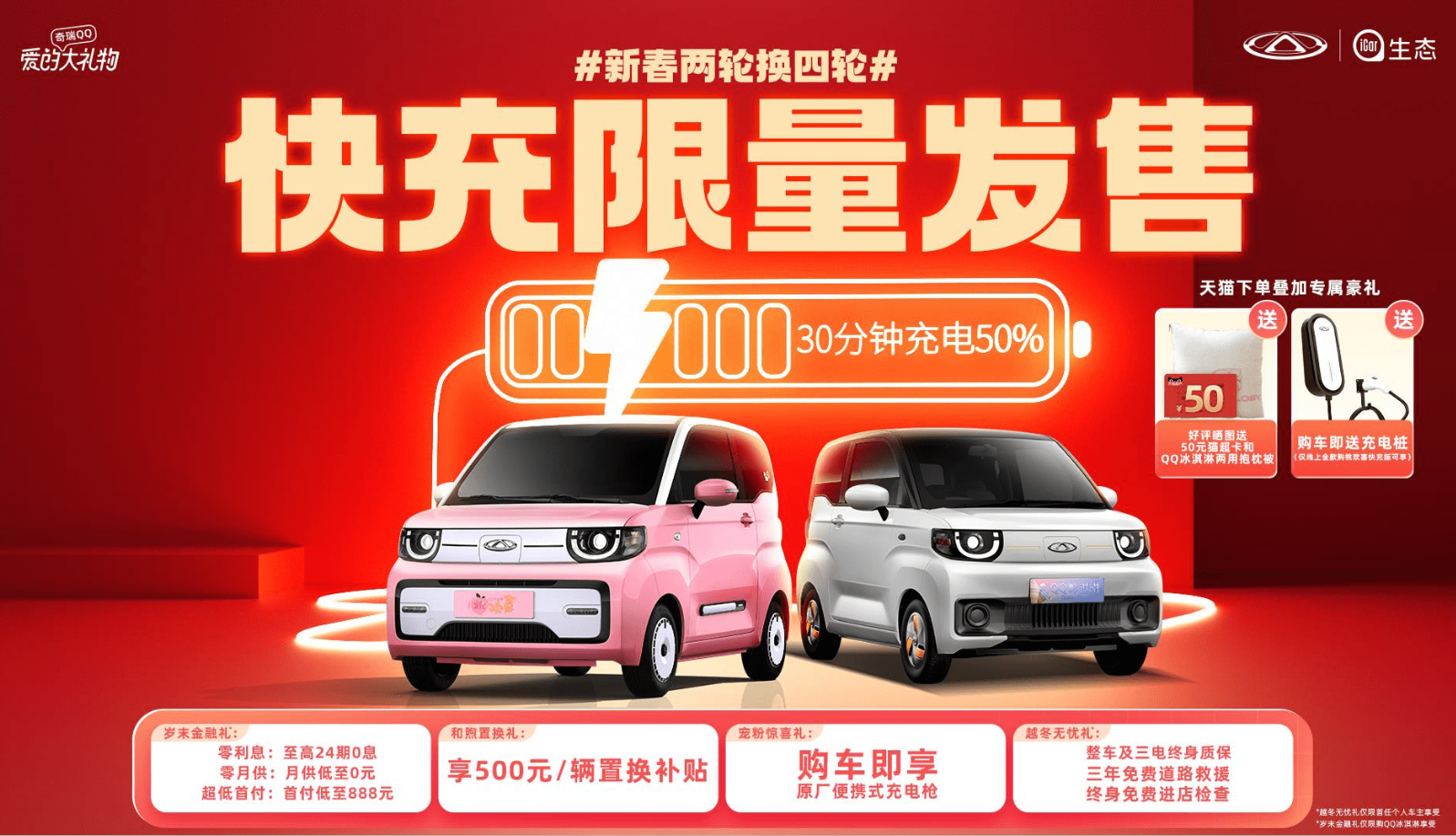 为回馈广大用户对奇瑞QQ冰淇淋长久地关注和支持,在双十二到来之际,奇瑞新能源“快充限量发售”活动火热进行中。限量1000台奇瑞QQ冰淇淋快充&100台QQ冰淇淋·桃欢喜快充,在天猫奇瑞新能源旗舰店购车送专属豪礼。12月12日更有叶一茜、李艾、一栗小莎子等20位明星红人直播,下单购QQ冰淇淋·桃欢喜即送充电桩,更有5折锦鲤车超级福利,鸿运当头,嗨购正当时!