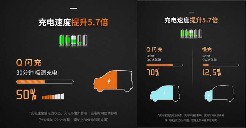 首先,Q闪充可以实现极速快充,相较常规充电速度提升了5.7倍。以120km续航为例,以往充满需5-6小时,加装Q闪充后仅需30分钟即可充至50%电量,充电时间更短,效率更高。