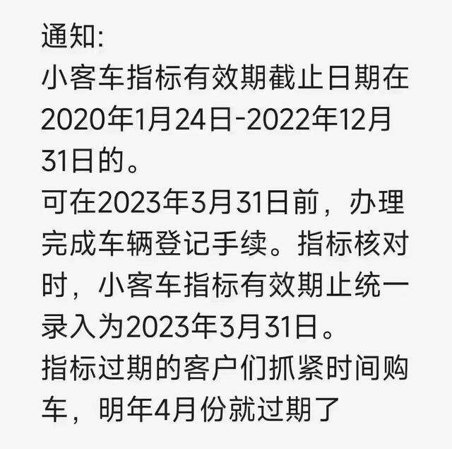 记者前两天在朋友圈发现一条消息疯传,全文如下:“通知:小客车指标有效期截止日期在2020年1月24日-2022年12月31日的可在2023年3月31日前,办理完成车辆登记手续。指标核对时,小客车指标有效期止统一录入为2023年3月31日。指标过期的客户们抓紧时间购车,明年4月份就过期了”