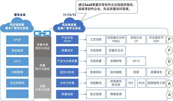 随着汽车行业整体数字化需求不断深化,企业的数字化需求也从单体的企业内部,延伸至外部供应链的深化需求,通过研发端协同、采购端协同、制造/质量协同及服务协同,实助力增质提效降本,最终实现产业链数字化、智能化的制造与服务。因此,汽车整车厂与配套厂都需要搭建起供应链质量数字化系统,以实现质量先期策划与保证、质量执行与监控、质量分析与改善,通过SaaS方式向零部件企业提供服务,赋能零部件企业,形成质量闭环管理。