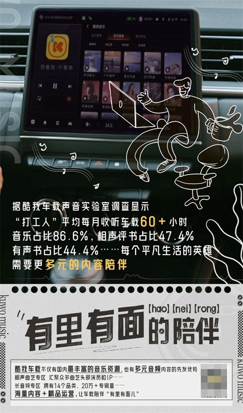 酷我车载声音实验室发现,“打工人”的需求其实是多样化的,在平均每月60小时以上的收听时间内,音乐占比86.6%,相声评书占比47.4%,有声书占比44.4%。