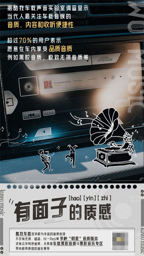 酷我车载针对车内环境,分析、测试形成各类音质的因素和标准,经深入研发,先后推出黑胶转录音乐、5.1环绕声音乐、银河音效、AI音效等领先成果,众多特色音质,不仅有无损、超品、Hi-Res等多种“明星”音质版本,还有车载黑胶音质及黑胶音乐专区,为用户带来极具质感的高端音乐享受,“面子感”十足。