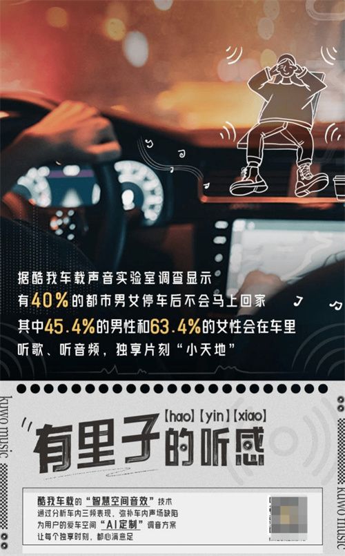 其次是通过AI定制,让“听感”个性愉悦。酷我车载声音实验室发现,当今时代生活节奏快,压力大,40%的都市男女停车后不会马上回家,其中45.4 %男性和63.4%女性会留在车里听歌、听音频,独享片刻“小天地”。