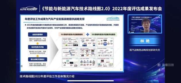 国汽战略院战略规划部研究员林艳代表研究工作组介绍了技术路线图2022年评估工作的总体情况。围绕政策、产业、技术等方向,回顾2022年全球汽车科技创新八大动向。面向节能与新能源汽车产业2025年关键里程碑目标,对本年度汽车产业进行了全面综合地总体评估。