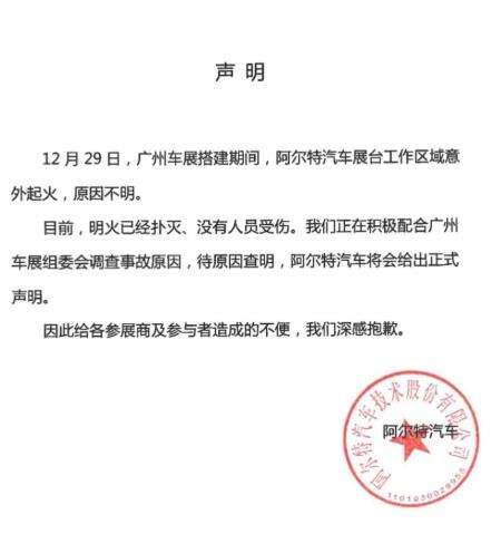 “IAT汽车”公众号发布声明表示,广州车展搭建期间,阿尔特汽车展台工作区域意外起火,原因不明。目前,明火已经扑灭、没有人员受伤。阿尔特正在积极配合广州车展组委会调查事故原因,待原因查明,阿尔特汽车将会给出正式声明。