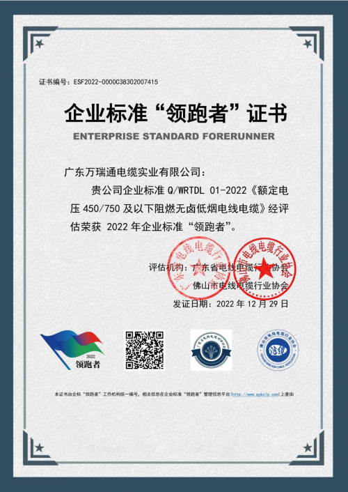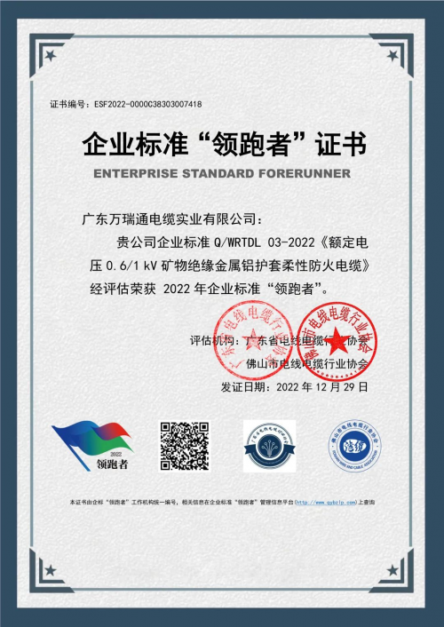 广东万瑞通电缆实业有限公司凭三项项企业标准Q/WRTDL 01-2022《额定电压450/750及以下阻燃无卤低烟电线电缆》、Q/WRTDL 02-2022《额定电压450/750及以下阻燃耐火无卤低烟电缆》及Q/WRTDL 03-2022《额定电压0.6/1kV矿物绝缘金属铝护套柔性防火电缆》分别入选阻燃电缆、耐火电缆、柔性防火电缆三大品类全国企业标准领跑者!