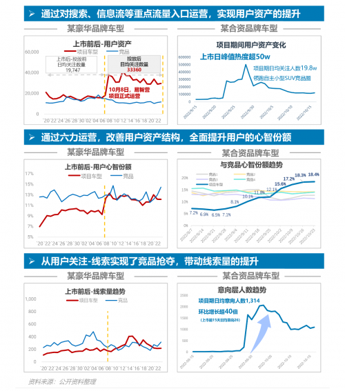 · 营销运营化的关键之一是运营的精细化,在精细化运营中,通过精心设计用户全生命周期旅程,细化汽车用户的决策、消费链条,帮助行业在用户全生命周期的链条上,针对不同阶段的用户,采取不同的营销方式与策略,通过持续释放营销势能,提升各阶段用户的心智浓度,对各阶段用户进行潜移默化的影响,进而不断提升用户的购车意愿,达成购车转化行为