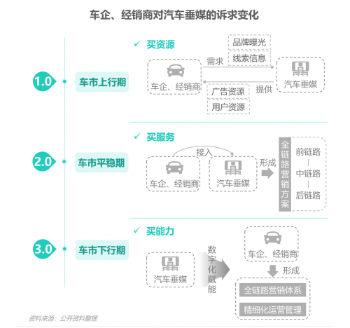 · 随着汽车市场的增速换挡,车企、经销商等对汽车垂媒的需求不断升级,从1.0的买资源:车市上行期,寻求品牌曝光和线索;到2.0的买服务:车市平稳期,寻求全链路营销解决方案;再转变到3.0的买能力:车市下行期,通过数字化赋能精细运营,实现覆盖全链路且提质增效的营销价值