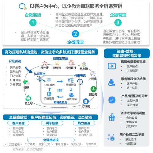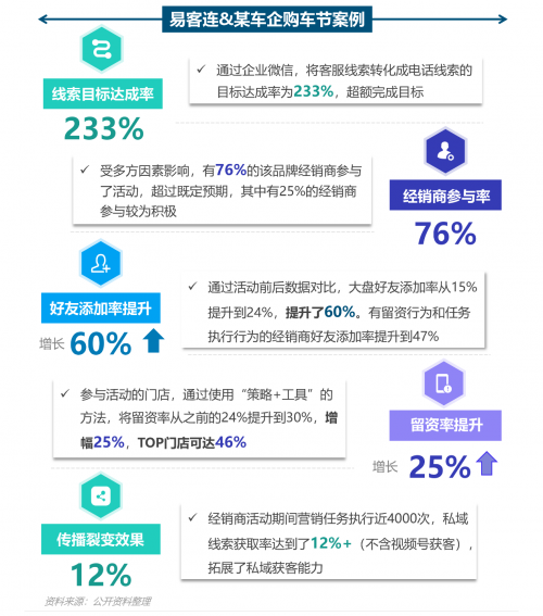 · 易车在“以人为中心”的理念下,基于企业微信打造的全域、全链路、数字化、智能化连接解决方案——易客连。其用企微串联营销的整个链条,借助企业微信的连接能力,帮助经销商引流获客,管理微信生态触达的全部客户,进行线上培育推进营销转化