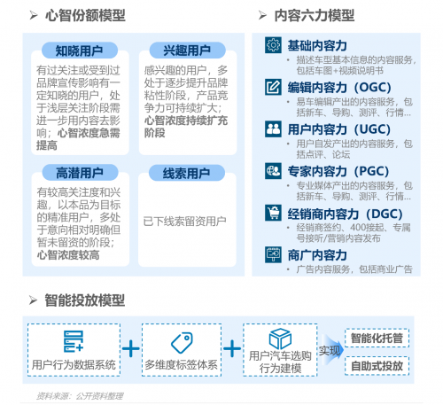· 基于腾易生态的汽车垂直生态、用户扩列赋能,易车开发出三大营销运营模型:针对用户资产,易车基于营销链路细致划分用户,并按照心智浓度将其数据化,从而将用户资产结构可视化;针对内容资产,打造内容六力模型,对品牌车系内容资产进行诊断分析,给出提升内容力手段策略;针对投放运营,基于易车用户行为数据系统、多维度标签体系和汽车选购行为建模,为客户提供智能化托管和自助式投放