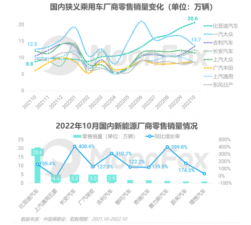 · 在汽车市场增速放缓和存量市场的大环境下,品牌之间的竞争越来越激烈;对比过去一年间的零售销量情况,各头部品牌经历的市场波动仍然较大,比亚迪由2021年10月的8.8万销量增长至2022年10月的20.6万销量,超越一汽大众成为当月国内汽车厂商零售销量第一名