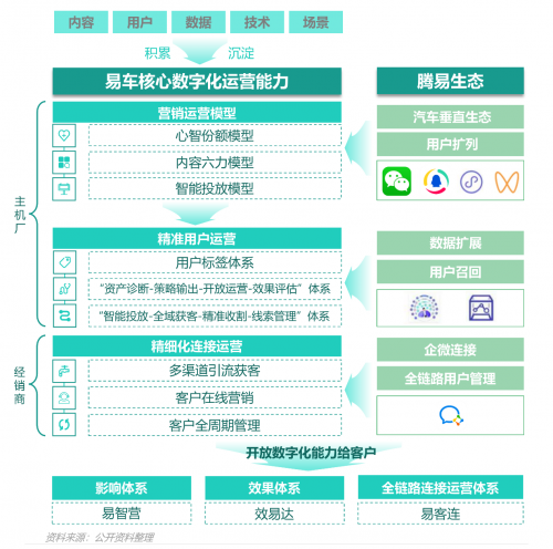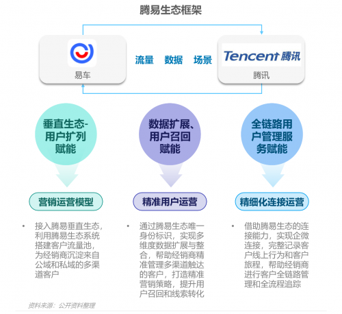 · 在腾易生态框架下,易车与腾讯在流量、数据、技术等层面进行紧密合作,针对易车核心数字化能力每个模块都有针对性的赋能,提升易车核心数字化营销运营能力。在营销运营模型上,腾易生态提供汽车垂直生态-用户扩列赋能;精准用户运营能力方面,提供数据扩展、用户召回赋能;精细化连接运营能力上,通过企微进行全链路用户管理服务