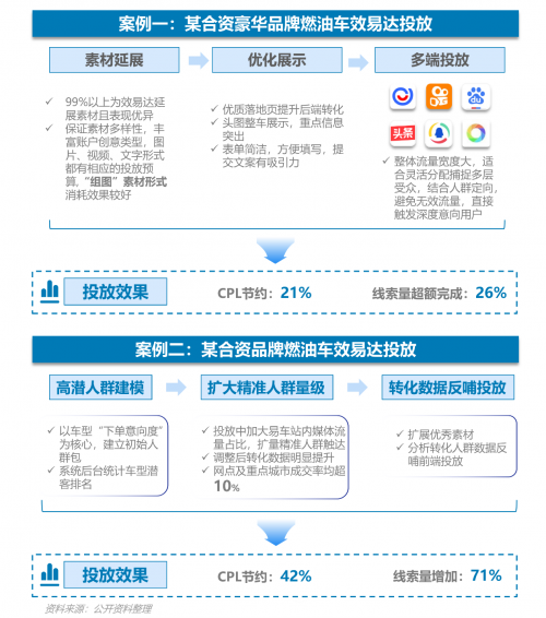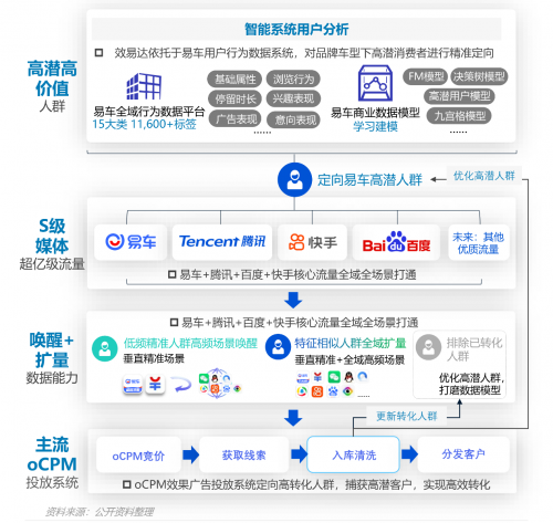 · 易车打造的垂直行业独立的全域智能效果广告产品。其依托于易车用户行为数据系统、多维度的标签体系,筛选品牌车型下的高潜消费者进行精准定向的同时,将易车、腾讯及第三方平台流量全域全场景打通,使用oCPM效果广告投放系统定向高转化人群,收获高潜客户,实现高效转化