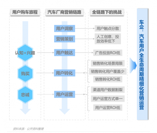 · 移动互联网的渗透深刻改变了用户群体特征和行为习惯,与此同时,车市正经历着一场深度变革和营销变局;对于汽车厂商和经销商而言,面对着动态变化的用户行为和市场格局,数字营销的难度不断上升,链路上各营销环节由于缺少整合和运营导致转化效率低下,汽车行业数字营销模式从“轻运营”向“重运营”的转变势在必行,倒逼数字营销从关注流量走向精细化运营阶段;车企在精细化营销运营阶段中,需要对用户消费的全生命周期进行营销运营