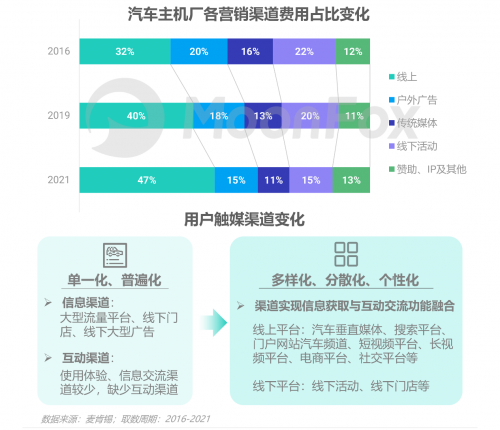 · 随着互联网用户用网行为的不断深入,车企持续增加对线上营销渠道的投入,公开数据显示,2021年线上营销投入占比47%,五年间提升了15个百分点