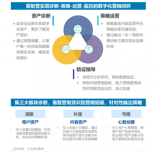 · 易车推出的车企营销资产智慧管家。针对车企在媒体端的数字化营销过程中缺少数据策略、效果难以评估反馈的问题,易车通过数据可视化建立“诊断-施策-运营-评估”营销闭环,实现营销的数字化管理和实施,最终实现数据决策、科学管理、智能经营