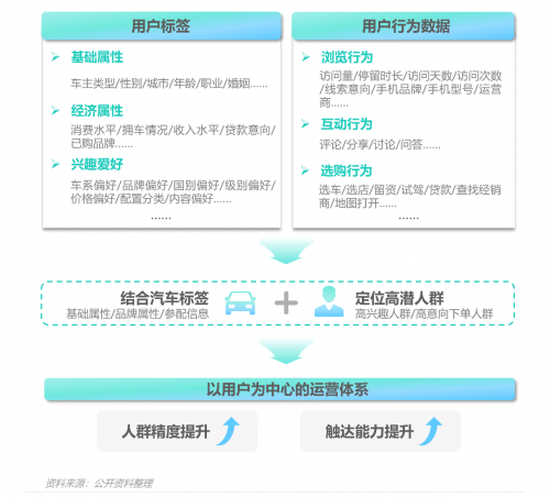 · 通过丰富的精细化的用户标签和用户行为数据绘制完整的用户画像,汽车行业建立起大数据分析的基础,打造汽车垂直数据体系,充分还原用户动态的使用场景和体验,实现对用户的深度理解