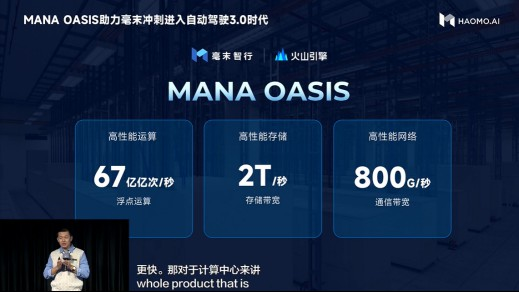据介绍,MANA OASIS由毫末智行与火山引擎联合打造,算力高达67亿亿次/秒,配备了存储带宽2T/秒的高性能存储和通信带宽800G/秒的高性能网络。“毫末训练平台部署到 OASIS上后,可以运行包括云端大模型训练、车端模型训练、标注、仿真等各类应用。”顾维灏表示,基于火山引擎丰富的大数据积累和底层技术,MANA OASIS实现的计算、存储、通讯能力,可以让GPU不再等待数据,数据转化成知识的速度也会更快。毫末数据、算力、训练效率也迎来全面提升。