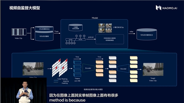 首先,视频自监督大模型,让毫末4D Clip标注实现100%自动化,人工标注成本降低98%。为了更低成本、更高效获取更多高价值数据,需要解决从离散帧自动化扩充到Clips形态的问题。毫末首先利用海量videoClip,通过视频自监督方式,预训练出一个大模型,用少量人工标注好的Clip数据进行Finetune(微调),训练检测跟踪模型,使得模型具备自动标注的能力;然后,将已经标注好的千万级单帧数据所对应的原始视频提取出来组织成Clip,其中10%是标注帧,90%是未标注帧,再将这些Clip输入到模型,完成对90%未标注帧的自动标注,进而实现所有单帧标注向Clip标注的100%的自动转化,同时降低98%的Clip标注成本。毫末视频自监督大模型的泛化性效果极佳,即使是在一些非常困难的场景,例如严重遮挡的骑行者,远处的小目标,恶劣的天气和光照,都能准确地完成自动标注。