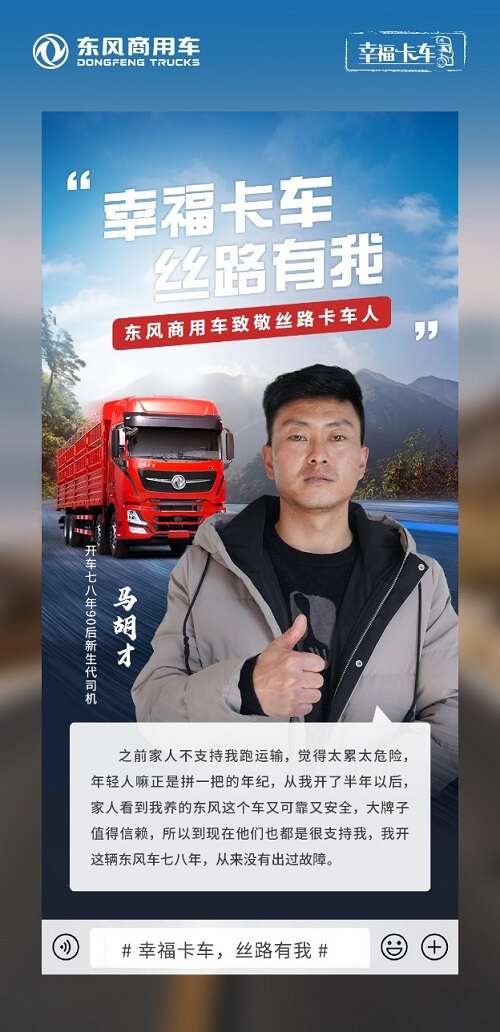 一阵铃响,手机上有一单去阿里的货,马师傅准备开车出发了。最后,马师傅补充道:“开东风天龙跑长途运输,在格尔木是一种传统。关键是90后都不太喜欢进厂受约束,跑大车这一行比较自由,只要自己辛苦一些,更有成就感。感谢东风商用车的支持,更感谢父老乡亲们共同努力,未来我们一起把格尔木建设得更加美好。”(中国网)