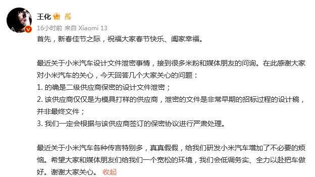 小米回应“汽车设计文件泄密”:非最终文件,将严肃处理