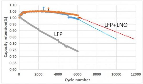 图1. 研一补锂剂LNO对提升磷酸铁锂/石墨体系循环性能测试结果