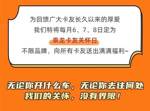 2022年11月,“67卡友日”再度升级为“乘龙卡友关怀日”,活动时间也从过去的每月6、7日两天,增加了一天,即每月6、7、8日,关怀的对象也不再限定乘龙的客户,而是所有卡友。关怀内容也不断丰富,包含了关怀礼、保养礼、好友礼、定制礼、惠享礼5大政策。新的“乘龙卡友关怀日”,进一步将乘龙的温度与关爱传递给更多的卡友。