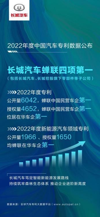2月份,中国汽车技术研究中心发布《2022中国汽车专利数据统计分析》。数据显示,2022年长城汽车专利公开量、授权量再创新高,蝉联中国民营车企年度专利公开量、在华车企专利授权量和新能源汽车领域专利公开量、授权量四项年度冠军。