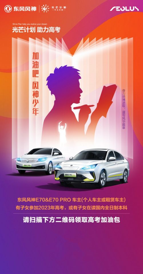 东风风神E70&E70 PRO车主(个人车主或租赁车主)有子女参加2023年高考或有子女在读国内全日制本科,即可报名申请光芒计划特别定制的高考加油礼包。